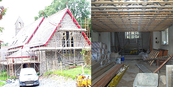 Renovation, Reclaimed large timber beams, Reclaimed stone work, Bespoke wooden window frames, Central heating, Drainage, Groundworks, Carpentry, Reclaimed wood for furniture, Restoration of bell, Reclaimed tile work from original layout, Bespoke conservatory, New driveway, Clearance of rubbish/debris